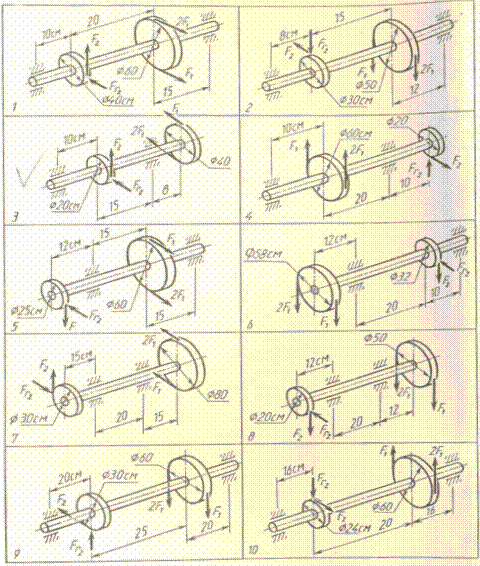 На вал жестко насажены шкив и колесо, нагруженные, как показано на рис.1.9. Определить силы F 2, F r2 = 0,4F2, а также реакции опор, если значение силы F 1 задано. Данные своего варианта взять из табл. 1.4, схемы с рисунка 1.9.
