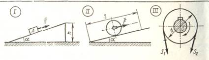 Задача 41. Груз А массой 200 кг с помощью наклонной плоскости с углом подъема α = 30° поднят на высоту h = 1,5 м силой, параллельной наклонной плоскости (рис. 1.10, схема I) с постоянной скоростью. При перемещении груза по наклонной плоскости коэффициент трения скольжения f = 0,4. Определить работу силы F.