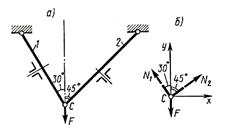Пример 1. Для данной системы двух стержней одинакового поперечного сечения, нагруженных силой F = 170 кН (рисунок 1, а), определить: