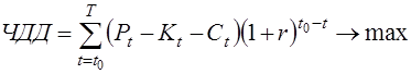 Разработанная в 1987 г. Типовая методика[1] отвечает подходу, рекомендуемому в методиках оценки эффективности инвестиционных проектов. В подавляющем числе изданий этот критерий называется чистым дисконтированным доходом (ЧДД), чистой дисконтированной стоимостью (ЧДС) или чистым современным доходом (ЧСД). В общем виде для его расчёта используют формулу: