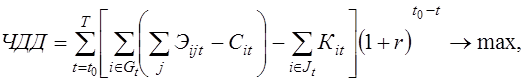 Приведённую выше формулу расчёта ЧДД необходимо скорректировать с учётом множественности мероприятий природоохранной программы. Обозначив мероприятие i = 1, n и зная сроки начала Tiн и окончания Tiк реализации этих мероприятий, получаем вариант расчёта ЧДД программы природоохранных мероприятий: