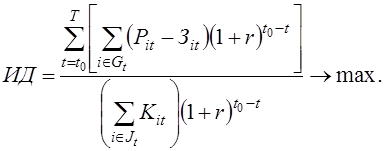Этот показатель представляет собой отношение дисконтированного результата к дисконтированным капитальным затратам и похож на показатель рентабельности, но учитывает фактор времени. Если ИД<1, то программа в пределах Т не окупается, если ИД>1, то программа окупается в пределах заданного горизонта планирования.