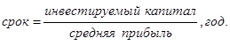 Метод оценки эффективности инвестиций по сроку окупаемости, называемый также методом возврата, или методом обратной выплаты капитала («pay off» или «pay back»), характеризует период времени, за который инвестиционный капитал возвращается (окупается) за счёт прибыли от реализации продукции. При этом сроку окупаемости соответствует период, когда величина прибыли становится равной величине инвестиций: