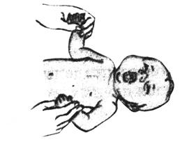 Методика вызывания рефлекса у новорожденного: при давлении на ладонь ребенка пальцем, открывается рот. В некоторых случаях сгибается голова.