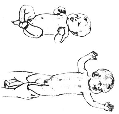 Аналогичное движение в руках возникает при пассивном внезапном вытягивании ног новорожденного