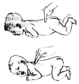 Методика вызывания рефлекса у новорожденного: ребенка укладывают лицом вниз на ладонь врача, исследующий слегка надавливая, проводит пальцем по позвоночнику ребенка от копчика до шеи. В ответ на это раздражение у ребенка» возникает кратковременное апноэ, резкий крик, лордоз позвоночника, разгибание рук и ног в сочетании с разгибанием головы, выпячивание ануса и мочеиспускание. Наиболее надежные компоненты - крик, разгибание конечностей, поднимание головы и таза.
