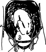 Рис. 34 Головка во входе таза. 1- пояс соприкосновения