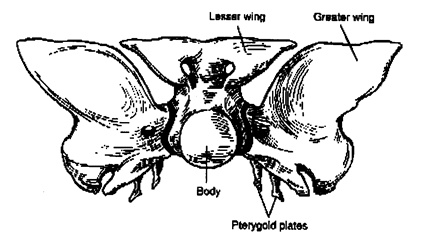 2. Соединение тела и комплекса большое крыло - крыловидные отростки - синхондроз до 1-2 лет, затем синостоз.
