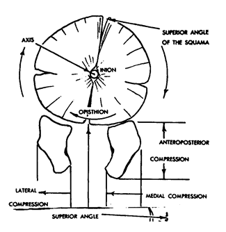 1. Высокая степень сопротивления мышц тазового дна при опускании головки в переднее и заднее затылочное предлежание. Головка поворачивается таким образом, что одна мыщелковая часть располагается медиодорзально, другая латеродорзально. Под давлением височная кость смещается медиально с медиальной мыщелковой частью и фиксируется во внутреннем вращении, приподнимая базилярный отросток затылочной кости с этой стороны. Во время последней части опускания головки затылочная кость смещается под теменные кости и каудальный край чешуи может давить вниз на одну или обе мыщелковые части.