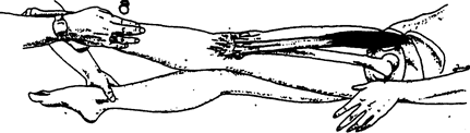 Рис. 49 Тестирование мышцы, напрягающей широкую фасцию бедра (медиальное направление сопротивления руки врача указано стрелкой)
