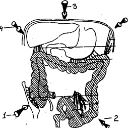 Рис. 50 Направление смещения кишечника, вызывающее растяжение его связок.