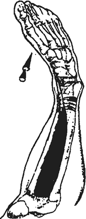 Рис. 51 Тестирование передней большеберцовой мышцы (каудо-латеральное направление сопротивления руки врача указано стрелкой)