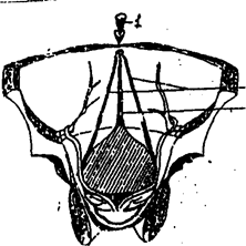 Рис. 52. Направление растяжения связок мочевого пузыря. А - вид сбоку. Б - вид сзади.
