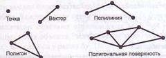 Двумя вершинами задается отрезок прямой (или вектор). Несколько векторов составляют полилинию. Полилиния может моделировать отдельный линейный объект, толщина которого не учитывается, а также может представлять контур полигона (участок плоскости). Полигон моделирует площадной объект. Один полигон может описывать плоскую грань объемного объекта. Несколько граней составляют объемный объект в виде полигональной поверхности - многогранник или незамкнутую поверхность (полигональная сетка).