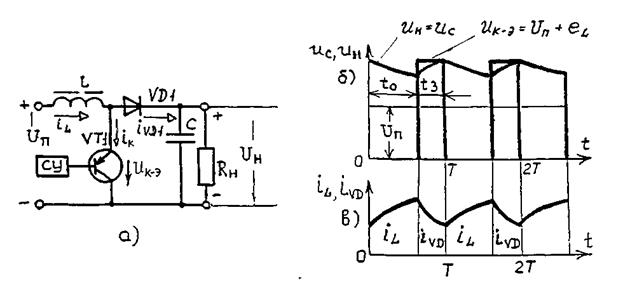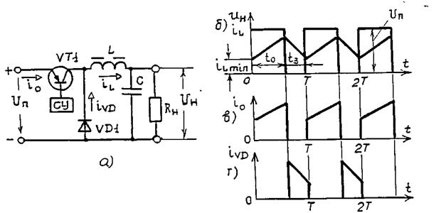 НППН инвертирующего типа. Третий тип НППН показан на рис.6.5,а. Его силовая схема образована транзистором, включенным последовательно с нагрузкой и дросселем, включенным параллельно ей.