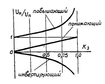 Важнейшей характеристикой НППН рассмотренных типов является регулировочная, показывающая зависимость коэффициента передачи от коэффициента заполнения, т.е. U н/ U п= f (к з). Графически регулировочные характеристики для рассмотренных типов НППН на основании выражений (6.4), (6.7), (6.11) характеризуются зависимостями, изображенными на рис.6.6.
