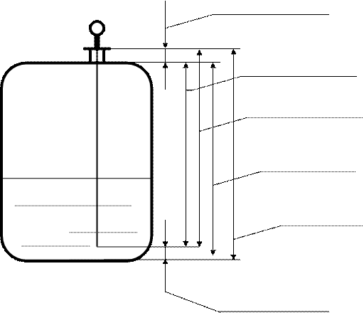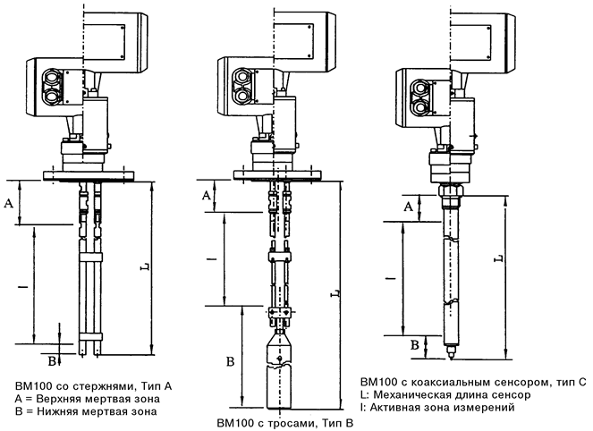 L = Полная длина сенсора включая верхнюю мертвую зону (A) и нижнюю мертвую зону (B). Нижняя мертвая зона зависит от типа сенсора и, как и верхняя мертвая зона, от величины диэлектрической проницаемости er.