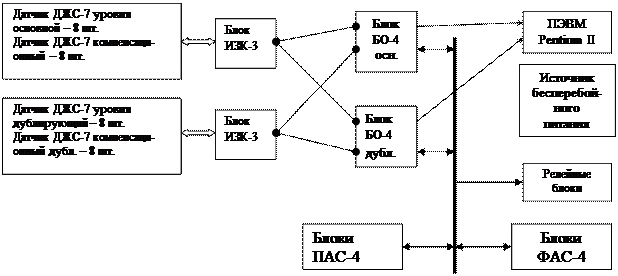 Структурная схема системы на 16 резервуаров с дублированием микропроцессорных блоков и дополнительными функциями приема и выдачи аналоговых сигналов.
