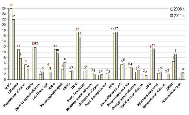 Доля федеральных округов и регионов во всех инвестициях в основной капитал, %