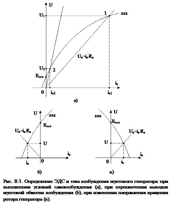. На рисунке В.3.а показано, что, в зависимости от сопротивления цепи возбуждения, точка пересечения может занимать положение 1 или 2, а напряжение на зажимах генератора будет, соответственно, U1 и U2.. Таким образом, самовозбуждение генератора обеспечивается и выходное напряжение регулируется в широких пределах.