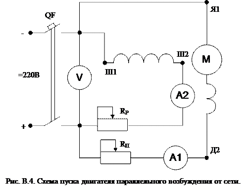 2.2. Подайте питание на шунтовую обмотку возбуждения, для чего взведите расположенный на стенде автоматический выключатель QF1. По показаниям амперметра убедитесь, что в цепи возбуждения машины есть ток, и его величина регулируется реостатом RР. Установите минимальный ток в шунтовой обмотке возбуждения.
