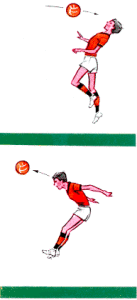Подбросьте мяч над собой, согните ноги в коленях, отклоните туловище и голову назад, прогнитесь в пояснице, напрягите мышцы спины и шеи. Резким движением туловища и головы вперед-вверх наносите удары по середине мяча. Ноги выпрямите одновременно с ударами головой.