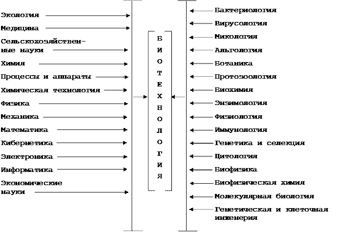 Древняя сфера производства, биотехнология в настоящее время представляет собой ультрасовременный этап научно-технического прогресса. Европейская федерация биотехнологии (EFB), созданная в 1978 г., считает, что биотехнология на основе применения знаний и методов биохимии, микробиологии, иммунологии, генетики, химической техники, электроники позволяет получать с помощью легкодоступных и возобновляемых ресурсов те вещества и соединения, которые важны для жизни и благосостояния людей. Если на начальном этапе биотехнология опиралась, главным образом, на микробиологию и энзимологию, то в настоящее время она получает мощные стимулирующие импульсы со стороны интенсивно развивающихся как биологических, так и небиологических областей науки (рисунок 1). Биотехнология обещает коренным образом изменить способы решения кардинальных проблем здравоохранения, охраны окружающей среды, сфер промышленного производства, обеспечения общества продовольствием.