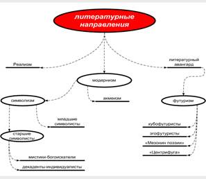 Русская литература XX века была представлена тремя основными литературными направлениями: реализмом, модернизмом, литературным авангардом. Схематично развитие литературных направлений начала века можно показать следующим образом: