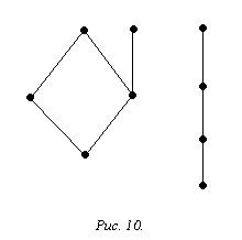 Любое частично упорядоченное множество можно представить в виде схемы, в которой каждый элемент изображается точкой на плоскости, и если у покрывает х, то точки х и у соединяют отрезком, причем точку, соответствующую х, располагают ниже у. Такие схемы называются диаграммами Хассе. На рис. 10 показаны две диаграммы Хассе, причем вторая соответствует линейно упорядоченному множеству.