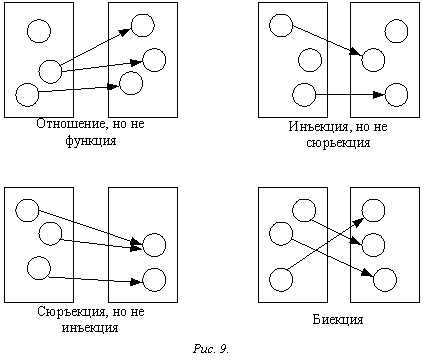 Рисунок 9 иллюстрирует понятия отношения, функции, инъекции, сюръекции и биекции.