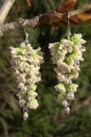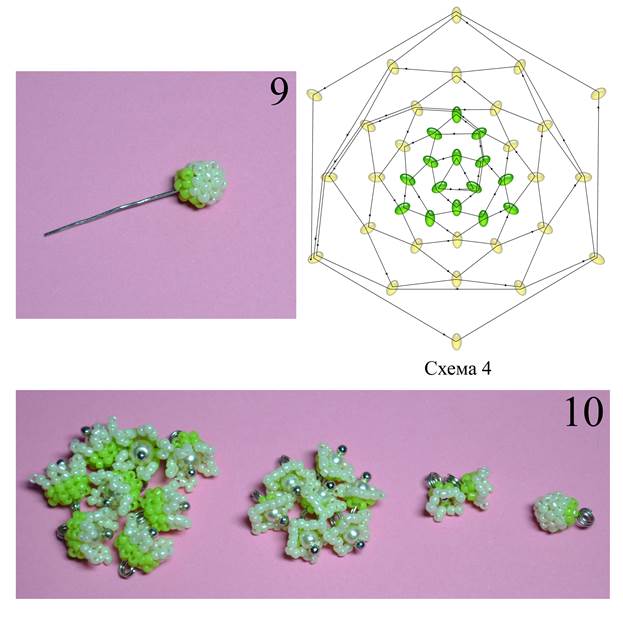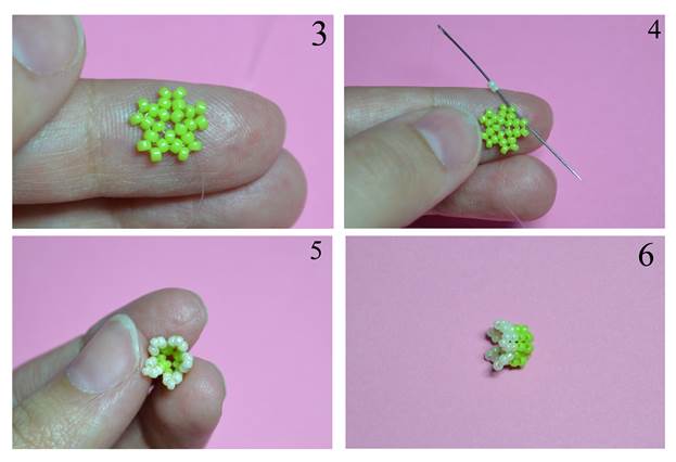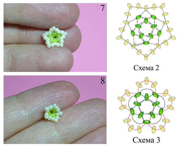 8. Самых маленьких цветочков нам понадобится по 2 на каждую серьгу. Выполняем их по схеме 3. Сначала замыкаем в кольцо пять бисерин зеленого цвета. Затем подплетаем зеленые бисеринки, которые будут основаниями лепестков. После этого на основании двух зеленых бисерин выполняем лепесток из трех кремовых бисеринок.
