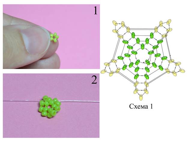 1. Начнем с создания самых крупных цветов, которые по форме напоминают колокольчики (схема 1). Отрезаем мононить, вдеваем один конец в иглу, набираем на нить 5 бисерин нежно-зеленого цвета и замыкаем их в кольцо.
