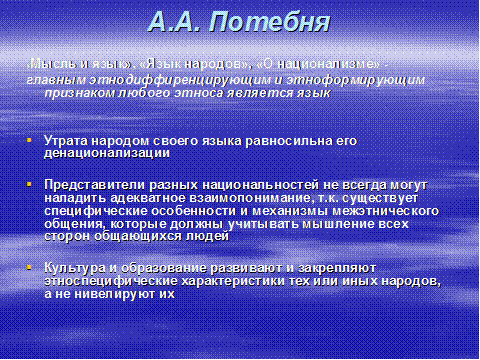 Овсянико – Куликовский: Язык - стержень народной мысли и психики, особая форма накопления и сбережения психической энергии народа. Нации: «активные» и «пассивные».