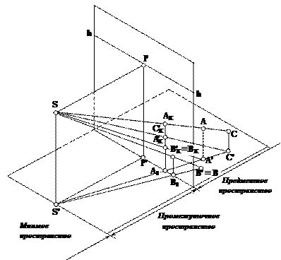 2. Точка С лежит на проецирующих лучах точки А. Перспектива точки С совпадает с перспективой точки А (СК ≡ АК), а перспектива основания С'К находится ближе к линии горизонта h–h.