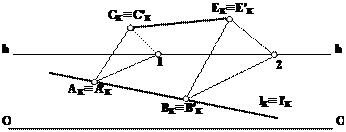 На прямой l выбрать произвольную точку А и построить произвольный треугольник АС1 так, чтобы вершина 1 находилась на линии горизонта. На прямой l выбрать другую произвольную точку В и построить треугольник ВЕ2 подобный треугольнику АС1 так, чтобы вершина 2 находилась на линии горизонта. Положение вершины Е покажет положение перспективы прямой СЕ, параллельной прямой l.