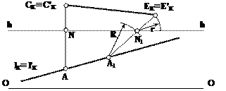 На прямой l выбрать точку А, находящуюся на одной линии проекционной связи с точкой С. Точку пересечения линии проекционной связи с линией горизонта обозначим буквой N. Выбрать на прямой l произвольную точку А1, из которой радиусом, равным АN (R = AN), провести дугу до пересечения с линией горизонта (точка N1), продолжить прямую А1N1, отложив на ней отрезок N1Е1, равный отрезку CN (r = CN), положение точки СЕ покажет положение перспективы прямой СЕ.