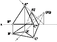 Решение. Поскольку сторона ВС принадлежит плоскости проекций Н и своей тени не отбрасывает, задача сводится к тому, чтобы построить тень от точки А (в данном случае на фронтальную плоскость проекций) и определить направление теней от сторон АВ и АС на горизонтальную плоскость проекций. Для этого следует построить гипотетическую тень от точки А на горизонтальную плоскость, которая должна оказаться во втором октанте. Направление теней, отброшенных на горизонтальную плоскость проекций от сторон АВ и АС, будет стремиться к этой гипотетической тени на горизонтальную плоскость от точки А. Точки пересечения этих теней с осью х определят направление теней, отброшенных на фронтальную плоскость от сторон АВ и АС.