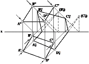Для того чтобы определить направление теней, отброшенных на горизонтальную плоскость проекций сторонами АВ и СD, построим гипотетические тени, которые отбросили бы на плоскость Н точки А и D – (А'Т) и (D'Т ). Точки пересечения горизонтальных теней от сторон АВ и СD определят направление теней на фронтальную плоскость от этих сторон.
