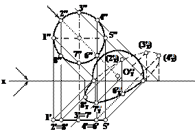Для того чтобы построить тень, падающую на горизонтальную плоскость проекций, построим тень от нескольких точек: 8Т, 7Т, и 6Т. Затем определим направление контуров тени на горизонтальную плоскость, построив и гипотетическую часть тени (2Т), (3Т) и (4Т), которая будет представлять собой эллипс.
