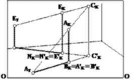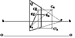Решение. Чтобы построить падающую тень от отрезка на вертикальную плоскость, надо спроецировать на эту плоскость светящуюся точку С 'К', провести фронтально-проецирующую лучевую плоскость. На пересечении лучей, проведенных через точки СКЕК и С 'К' Е 'К', и будет тень ЕТ, а след плоскости будет тенью от отрезка.