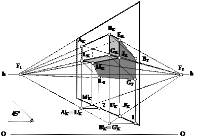 Решение. В этом примере удобно провести горизонтально-проецирующие лучевые плоскости. Горизонтальный след этих плоскостей будет проходить через перспективу основания источника света и перспективу основания точек А и В. Точка пересечения следа плоскости со световым лучом и дает тень от точки А на пол. Такое построение называется методом парусов.