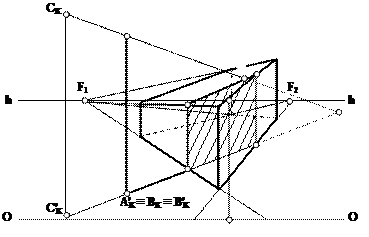 4. Тень от вертикали АВ будет идти от тени точки В на предметную плоскость (совпадающей с самой точкой В), вдоль перспективы основания светового луча до пересечения с поверхностью призмы (точка 1'К). Далее – вдоль линии пересечения плоскости световых лучей с поверхностью призмы. Граничной точкой тени (АТ) будет точка пересечения линии 1К1'К2'К2К с перспективой светового луча.