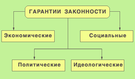 Гарантии законности - это определенный комплекс организационных, экономических, политических, идеологических факторов и юридических мер, обеспечивающих соблюдение норм права, защиту прав граждан и интересов общества и государства.