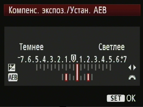 На дисплее камеры отобразится пиктограмма из трёх кадров — заштрихованного, чёрного и пустого, а на шкале экспозиции появятся ползунки в области заданного шага брекетинга.