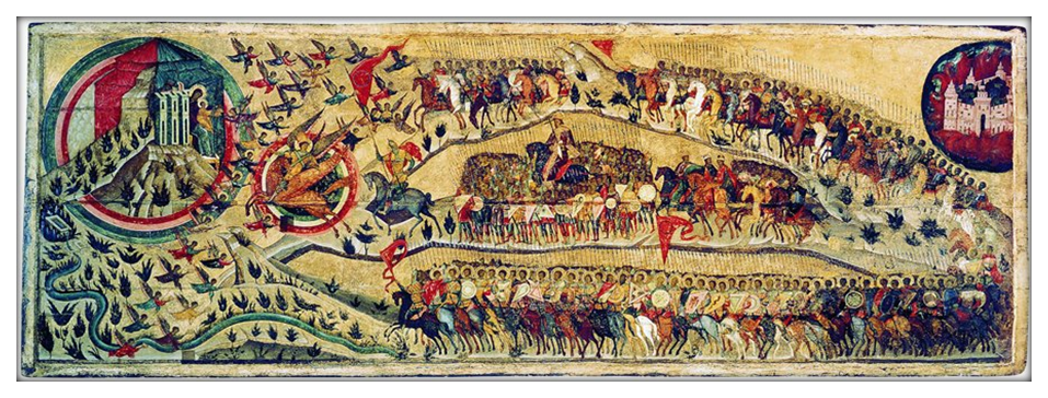 Справа показана пылающая Казань — «град нечестивых». Благословляемое Богоматерью с младенцем, тремя дорогами направляется к Москве — «горнему Иерусалиму» многочисленное пешее и конное войско (оно же и «воинство Небесного Царя»). Прямо за архангелом Михаилом скачет с алым знаменем юный Иван Грозный. Среди войска и византийский император Константин, русские князья Борис и Глеб, Владимир Мономах, Александр Невский, Дмитрий Донской и другие. Войско встречает сонм летящих ангелов. Полноводная река символизирует «третий Рим» — Москву, она противопоставлена иссякшему источнику — «второму Риму» - Византии.