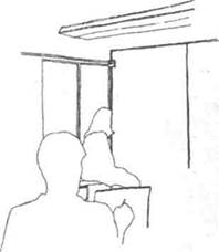 6. Глядя сквозь сетку, определите углы линий потолка относительно горизонтальной линии сетки. Вы можете обнаружить, что все углы разные. Хотя вы знаете, что потолок плоский и стыкуется со стенами под прямым углом, отрекитесь от этого знания и рисуйте каждый угол так, как видите его. Спрашивайте себя: «Какова величина этого угла относительно горизонтальной линии сетки?» Затем рисуйте этот угол на бумаге, не думая о нем. Не усложняйте себе работу, не пытайтесь разобраться, почему этот угол именно такой. Ваша цель — увидеть, какой он есть, и отразить свое восприятие в рисунке. (Рис. 17.12 служит примером такого визирования, но имейте в виду, что углы вашего потолка будут другими, если ваша «точка зрения» другая.)