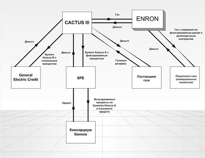 Новый ход конем Энди Фастова получил называние Кактус III. Прорыв заключался в том, что ценные бумаги SPE (целевой компании), обеспеченные портфелем газовых резервов предлагались не на открытом рынке, а специальному консорциуму инвесторов и банков.