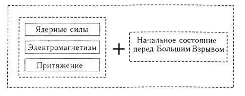 Считаю своей обязанностью сразу подчеркнуть, что я говорю не просто о «теории всего», которую в ближайшее время надеются открыть специалисты в области физики элементарных частиц. Их «теория всего» стала бы объединенной теорией всех основных сил, известных физике, а именно: гравитационных, электромагнитных и ядерных сил. Она также описала бы все типы существующих дробноатомных частиц, их массы, спины, электрические заряды и другие свойства, а также принцип их взаимодействия. При наличии достаточно точного описания начального состояния любой изолированной физической системы, такая теория сможет предсказать будущее поведение системы в принципе. В случае, когда точное поведение системы предсказать невозможно, теория опишет все возможные варианты поведения системы и предскажет вероятность их возникновения. На практике нередки случаи, когда начальные состояния интересующих нас систем невозможно определить точно, да и предсказать их слишком сложно во всех случаях, кроме простейших. Тем не менее, такая объединенная теория частиц и сил вместе с определением начального состояния Вселенной к моменту Большого Взрыва (сильный взрыв, от которого произошла Вселенная), в принципе, содержала бы всю информацию, необходимую для предсказания всего, что можно предсказать (рисунок 1.1).