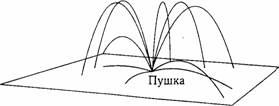 Я попытаюсь заново сформулировать последнее требование, не принимая во внимание предубеждения редукционистов. Законы движения любой физической системы дают только условные предсказания и, следовательно, совместимы со многими возможными вариантами развития этой системы. (Это не зависит от ограничений предсказания, которые накладывает квантовая теория и о которых я расскажу в следующей главе). Например, законы движения, которым подчиняется ядро, выпущенное из пушки, совместимы с многими возможными траекториями, каждая из которых соответствует одному из возможных направлений и подъемов ствола пушки при выстреле (рис. 1.2).