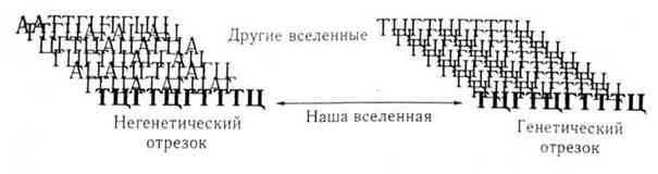 | Рис. 8.1. Взгляд из мультиверса на два отрезка ДНК, которые оказываются идентичными в нашей вселенной, один — случайный, другой находится в гене |